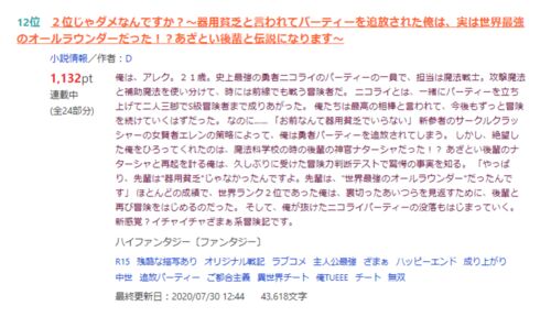 昨日投稿した『2位じゃダメなんですか?~器用貧乏と言われてパーティーを追放された俺は、実は世界最強のオールラウンダーだった!?あざとい後輩と伝説になります~』ですが、予想以上の反響で、人生初の総合ランキング入りしてしまいました(笑) 小説家に…