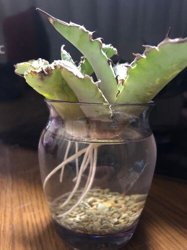 アガベの根だしは水耕栽培がおススメです。 輸入株の裸苗で購入したアガベのチタノタ。 根はカラカラに枯れ下葉も傷んでますので一度綺麗に切り除き、水耕で根をだします。 購入した日 1月15日 水質が悪化するのを防ぐために、ゼオライトを少し入れました。…